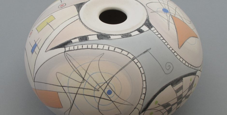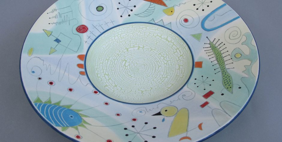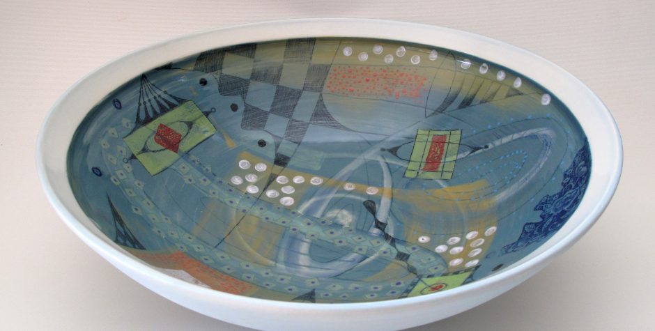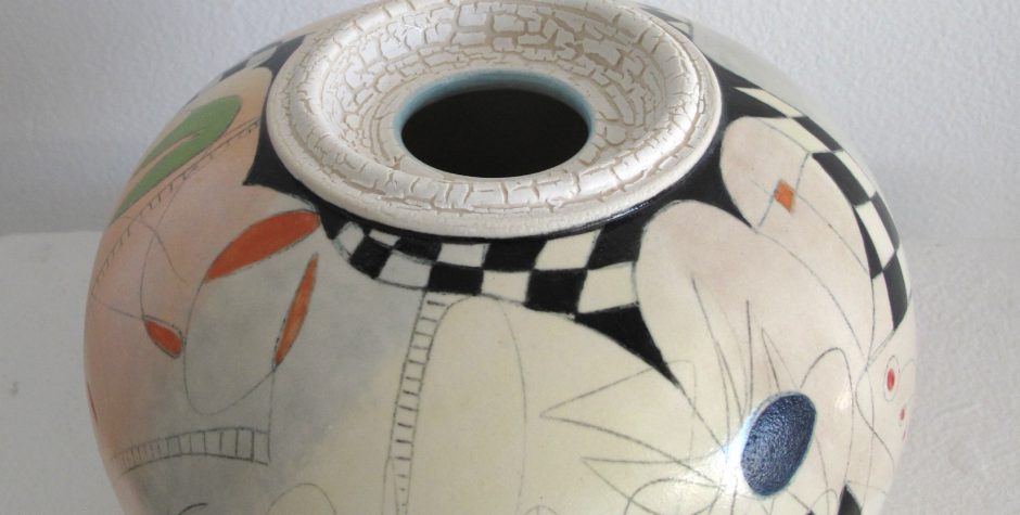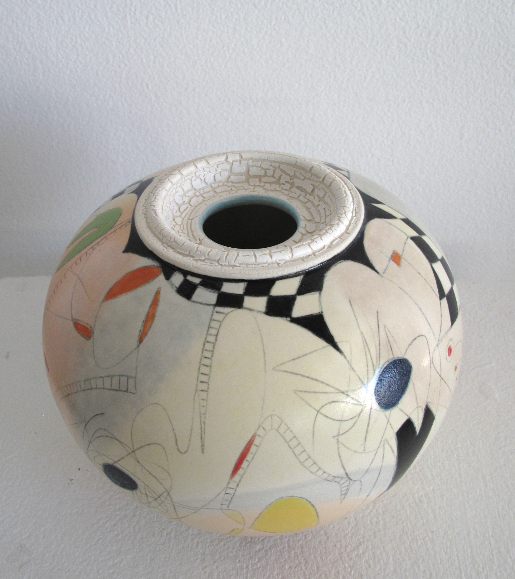 Newcastle Herald ART review: Back to Back Galleries Connections is a joint exhibition from two highly respected local artists, Sue Stewart and Elsie Randall. Stewart’s work has taken a radical change in direction, inspired by Modernist masters such as Miro, Klee and Kandinsky and the surfaces of her ceramic forms have now become the canvases for the joyous adventures in line and colour.