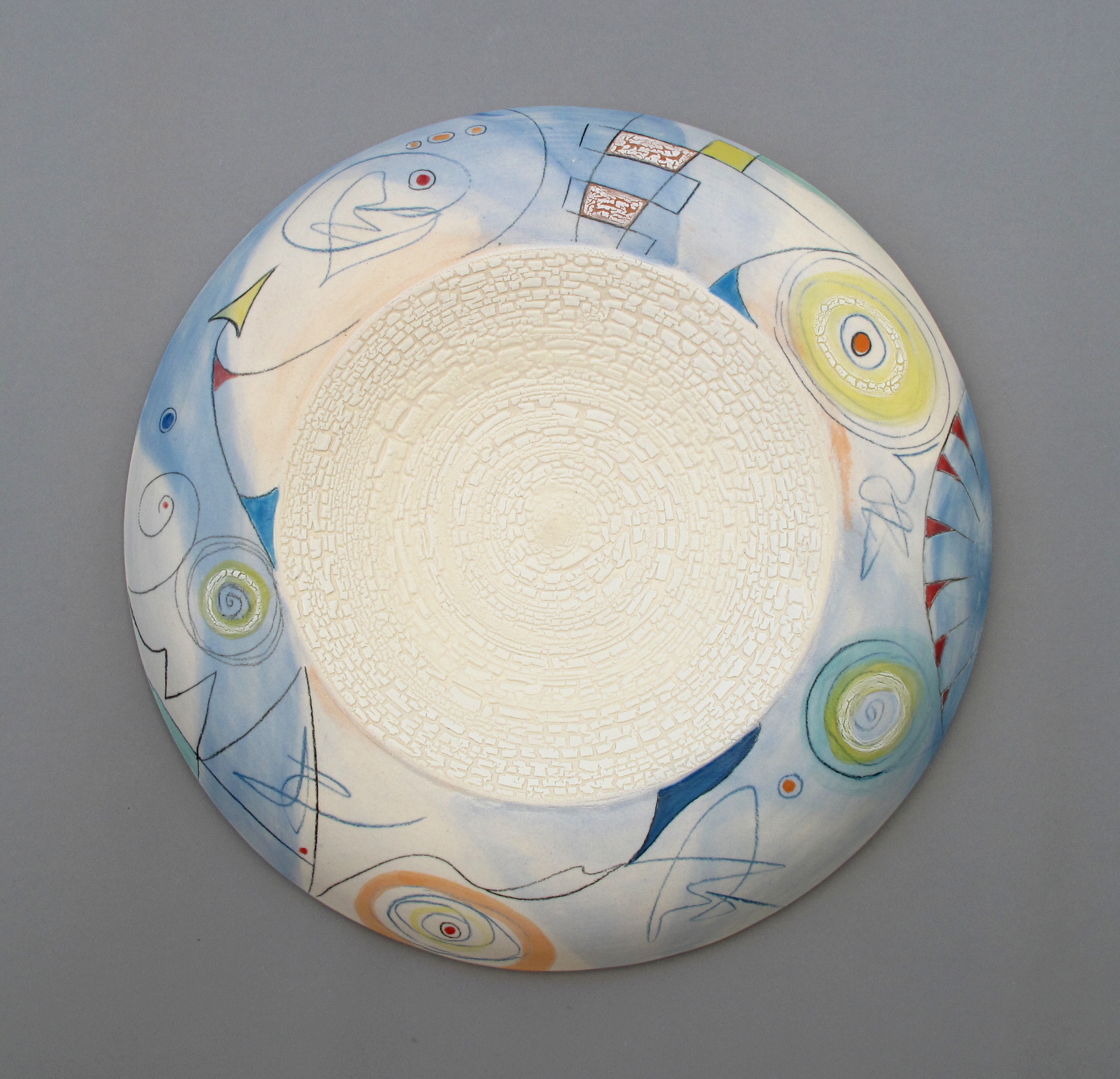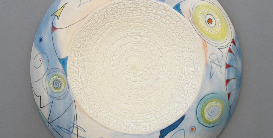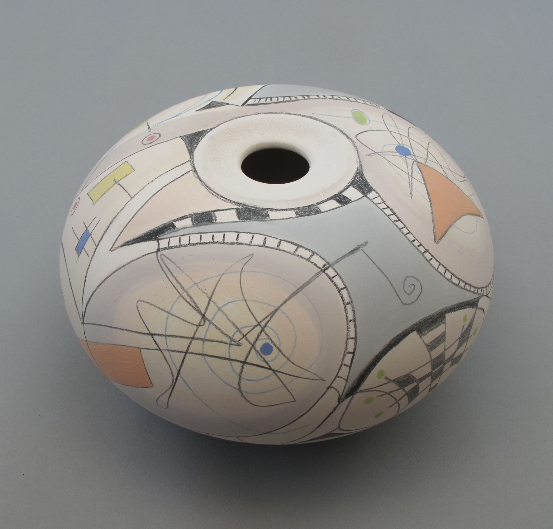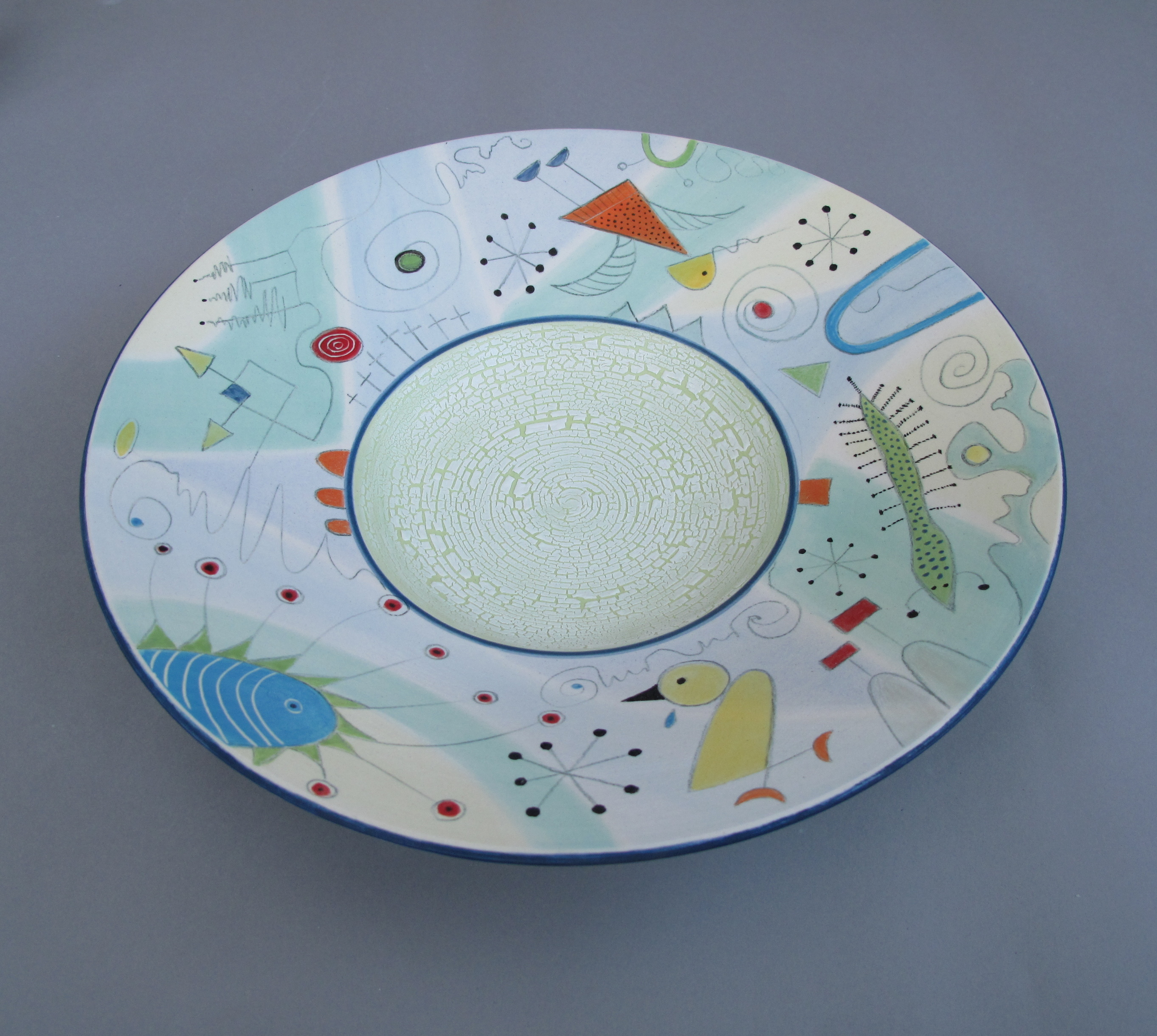 Newcastle Herald ART review: Back to Back Galleries Connections is a joint exhibition from two highly respected local artists, Sue Stewart and Elsie Randall. Stewart’s work has taken a radical change in direction, inspired by Modernist masters such as Miro, Klee and Kandinsky and the surfaces of her ceramic forms have now become the canvases for the joyous adventures in line and colour.