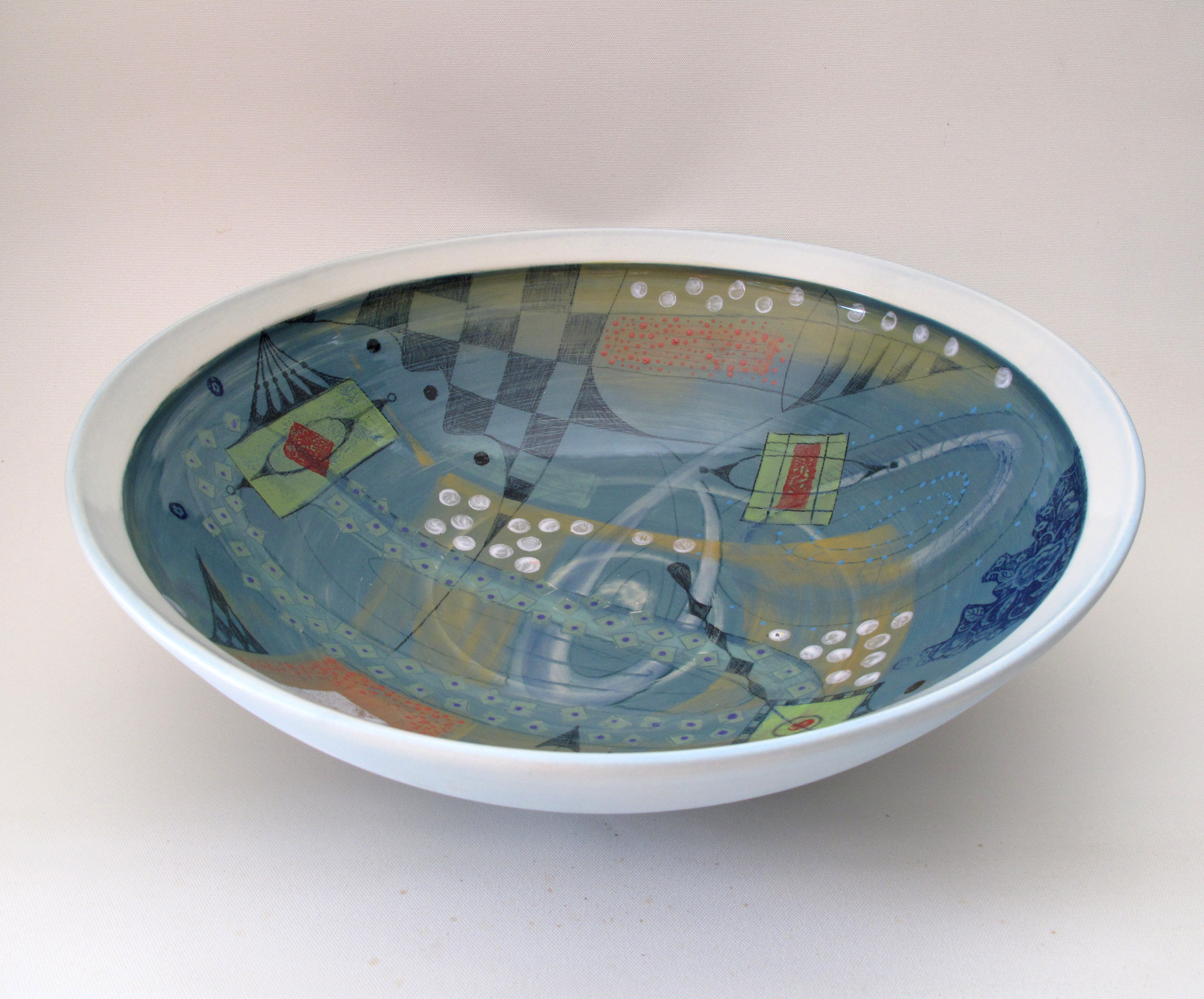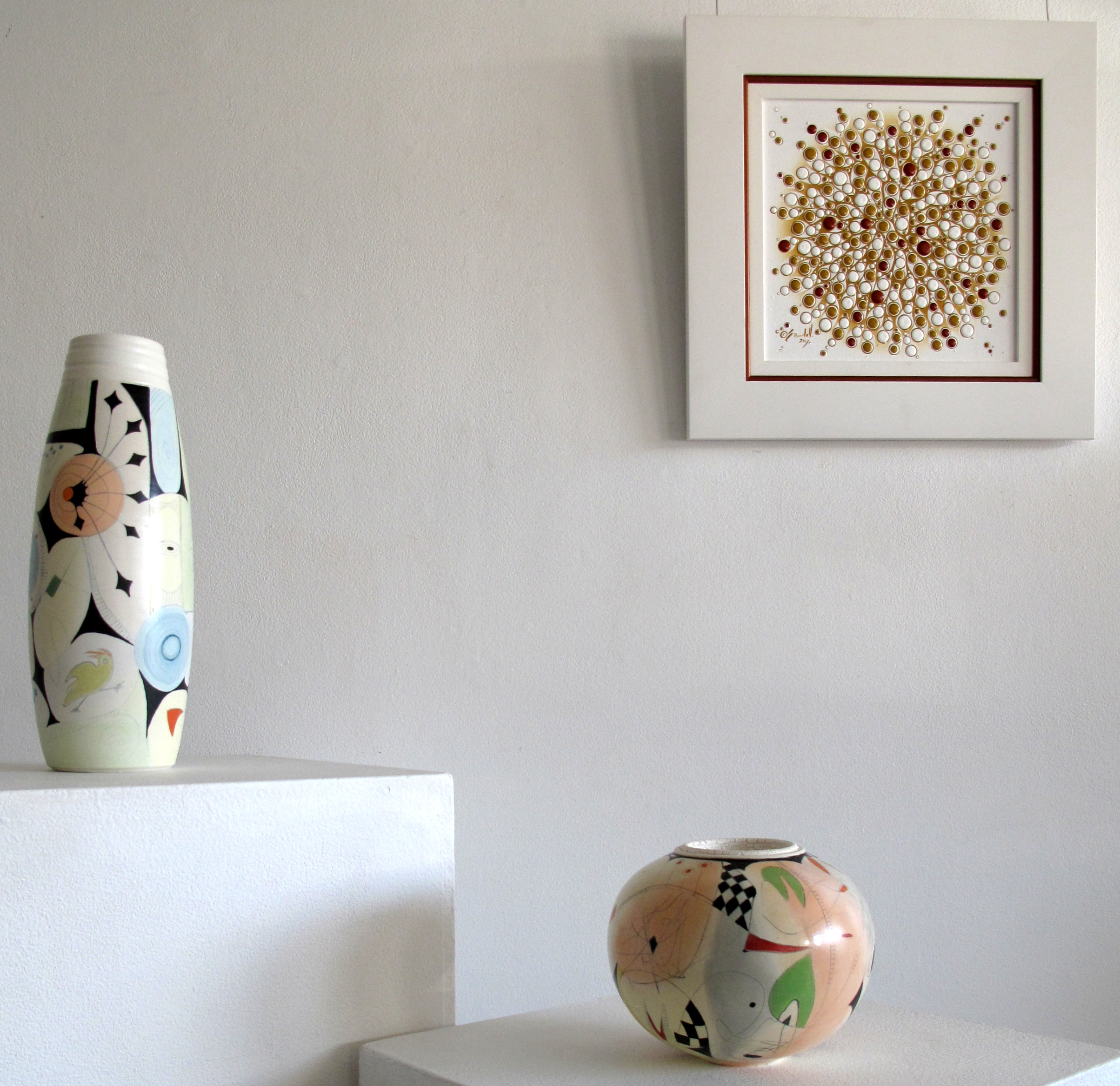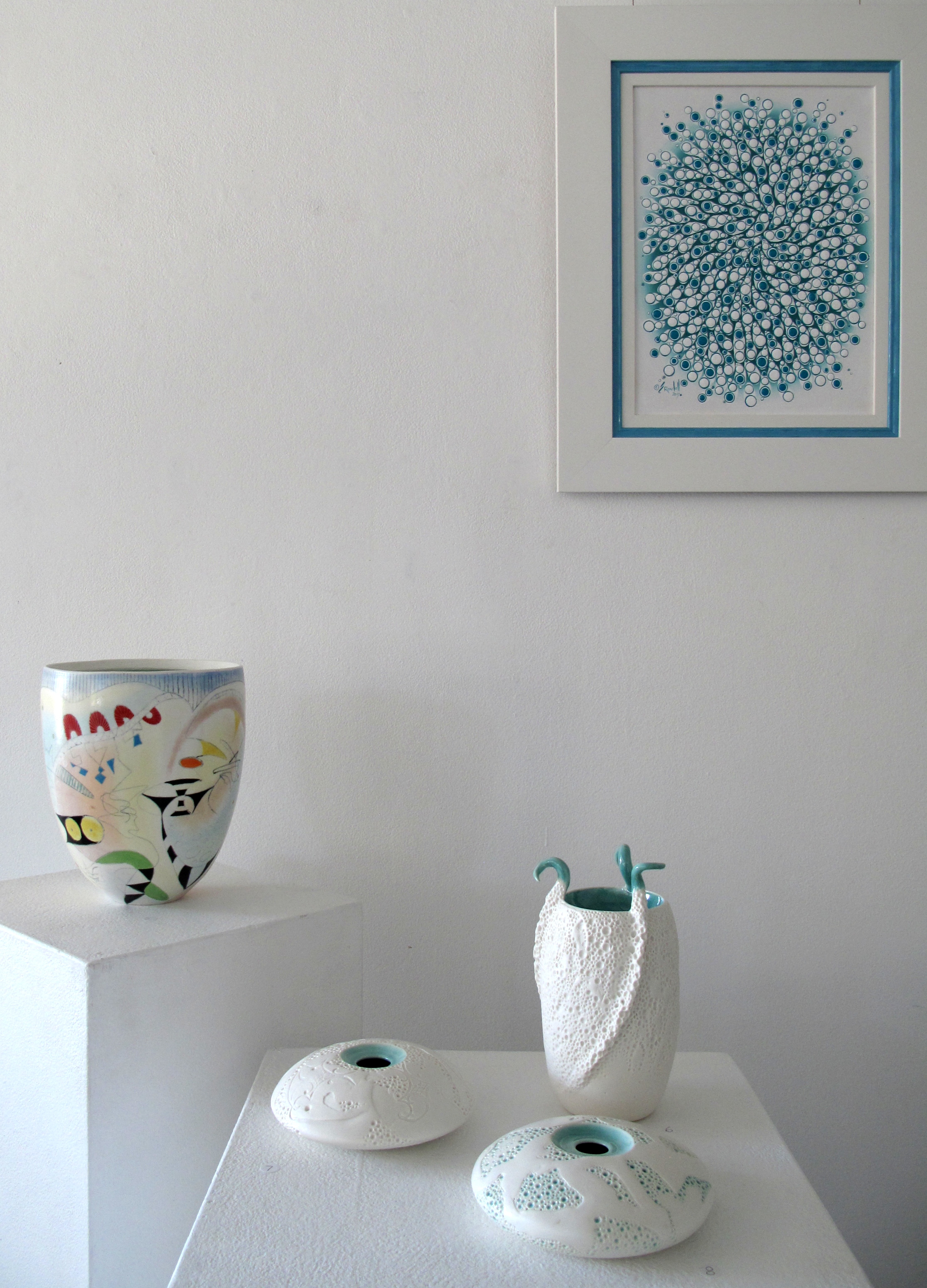 I have continued on with the style from the last exhibition, working intuitively with line and color on the surfaces of various forms