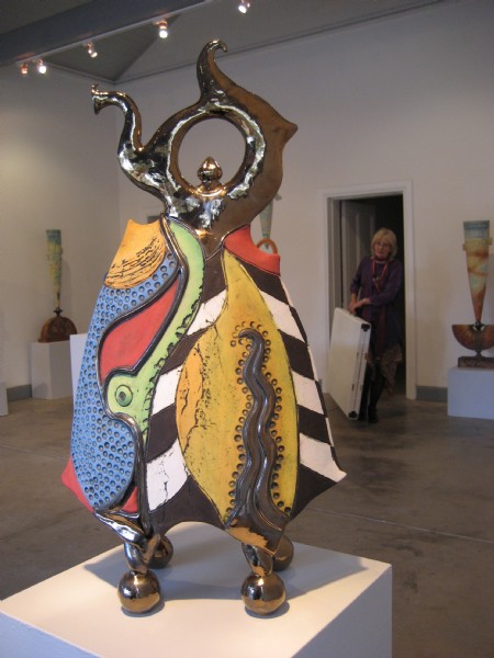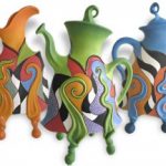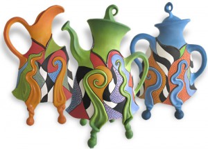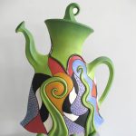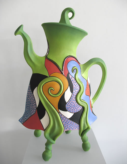 Picture: Last Tango Teapot, Jitterbug Jug and Blue Suede Shoes. These large sculptural domestic pots explode with color and energy. The sole purpose of these ‘utilitarian’ vessels is to delight and amuse the viewer. They are made from earthenware paperclay and decorated with underglazes.